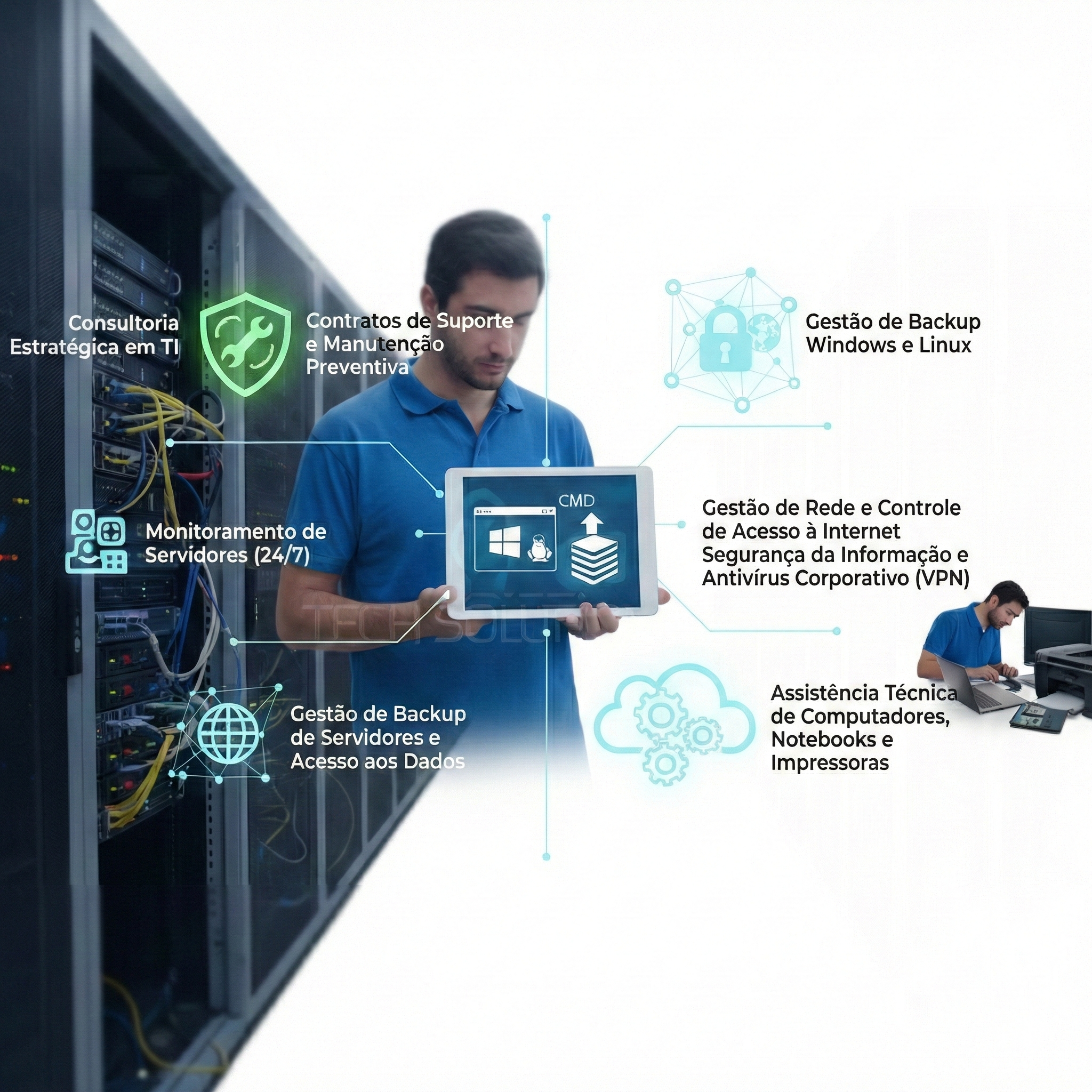 – Consultoria Estratégica em TI – Terceirização (Outsourcing) de TI – Contratos de Suporte e Manutenção Preventiva – Administração de Servidores Windows e Linux – Monitoramento Proativo de Servidores (24/7) – Gestão de Backup e Recuperação de Dados
